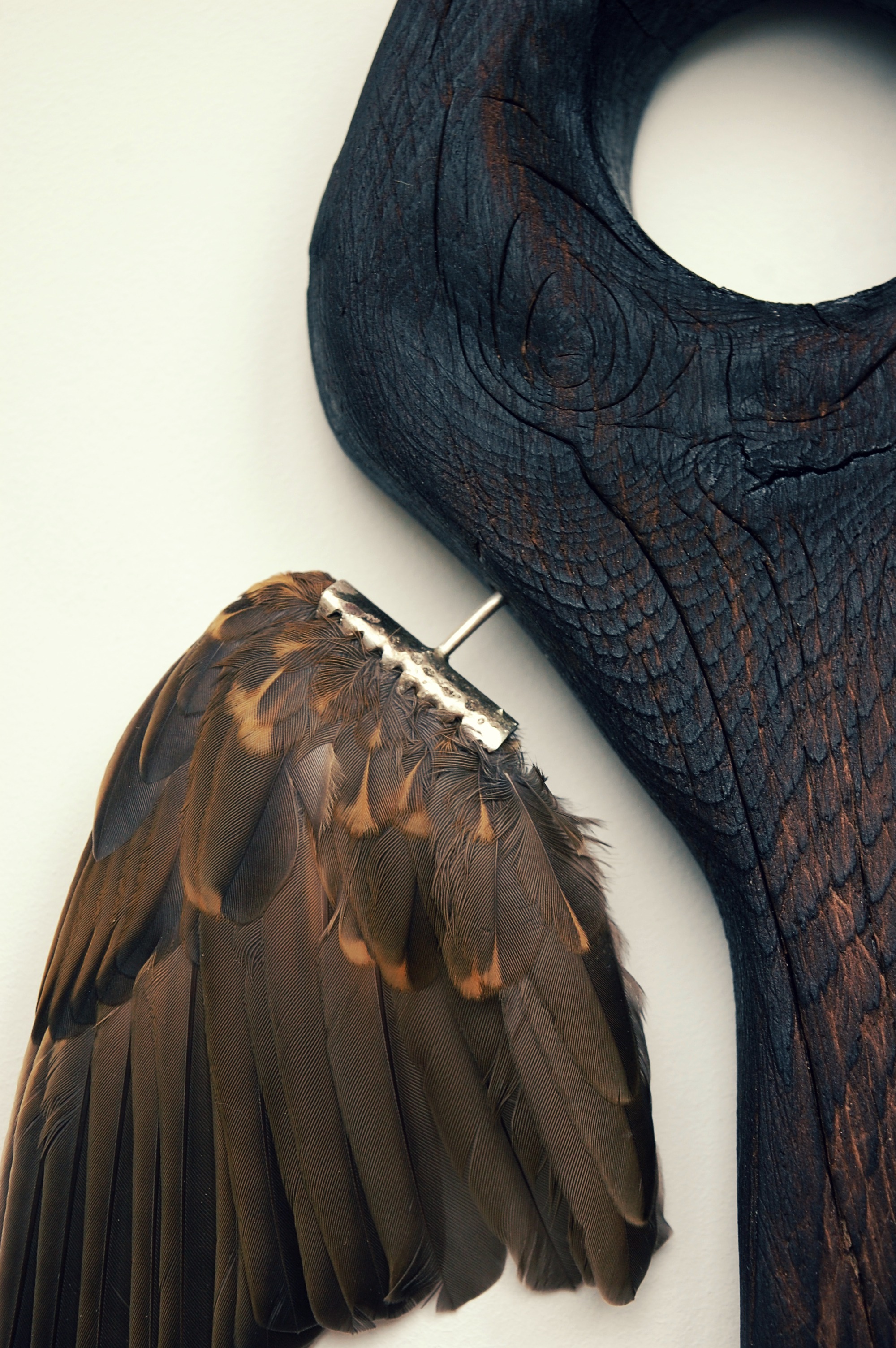 Technique: burned and carved wood, real bird wings, real bird legs, silver connectors