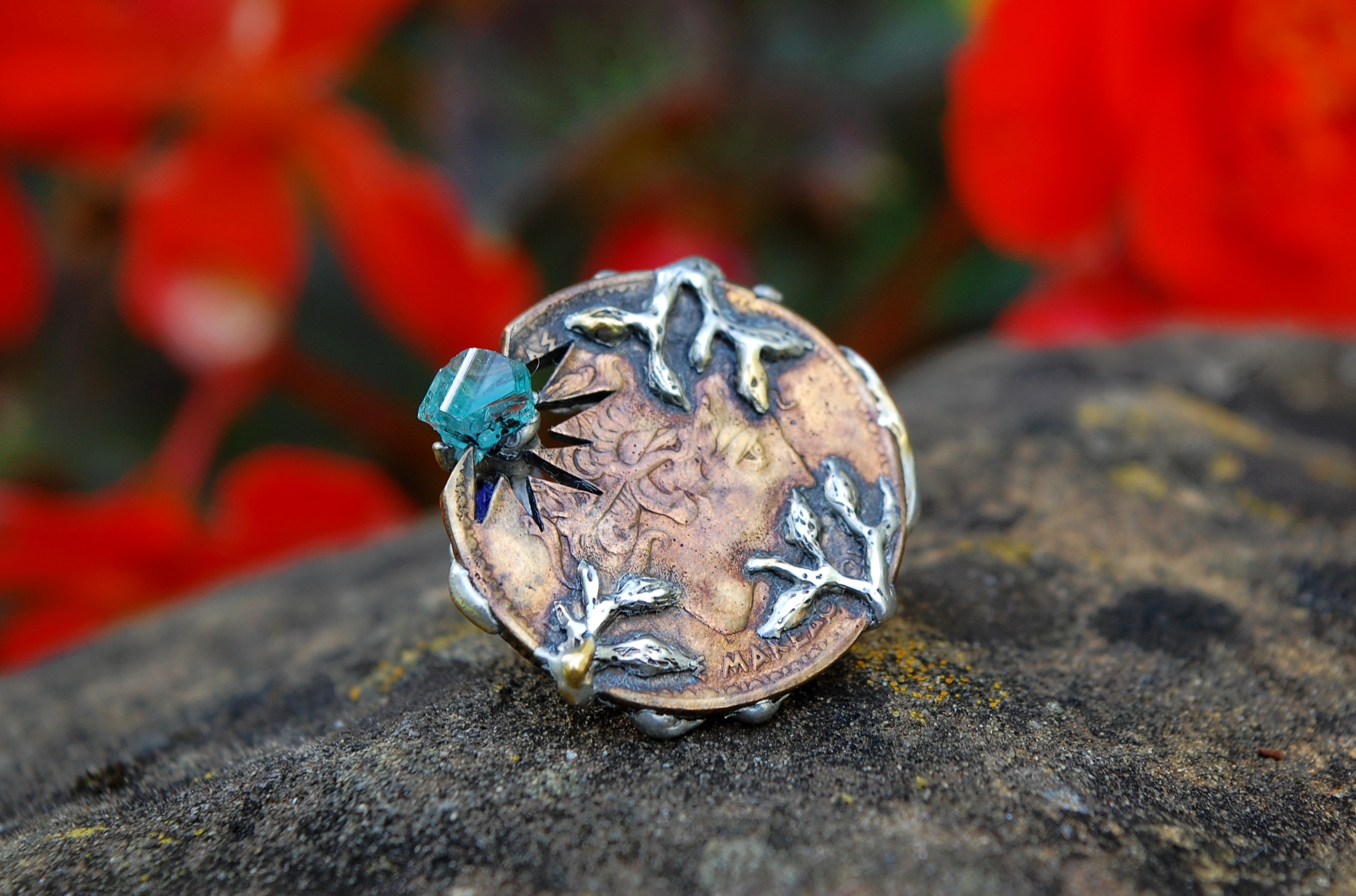 Blue glass shards emerge along the sides of the ring, like crystalline residues of the city — fragments of the contemporary world embedded into the piece. They catch the light with an almost gem-like presence, blurring the boundary between the precious and the discarded.