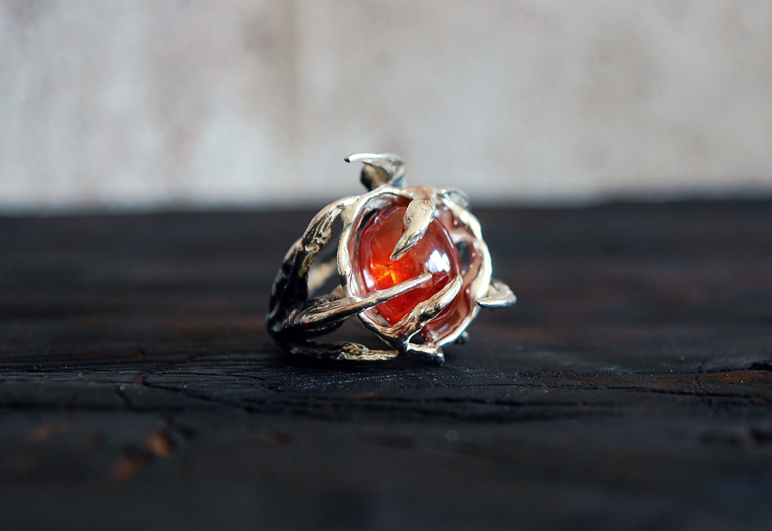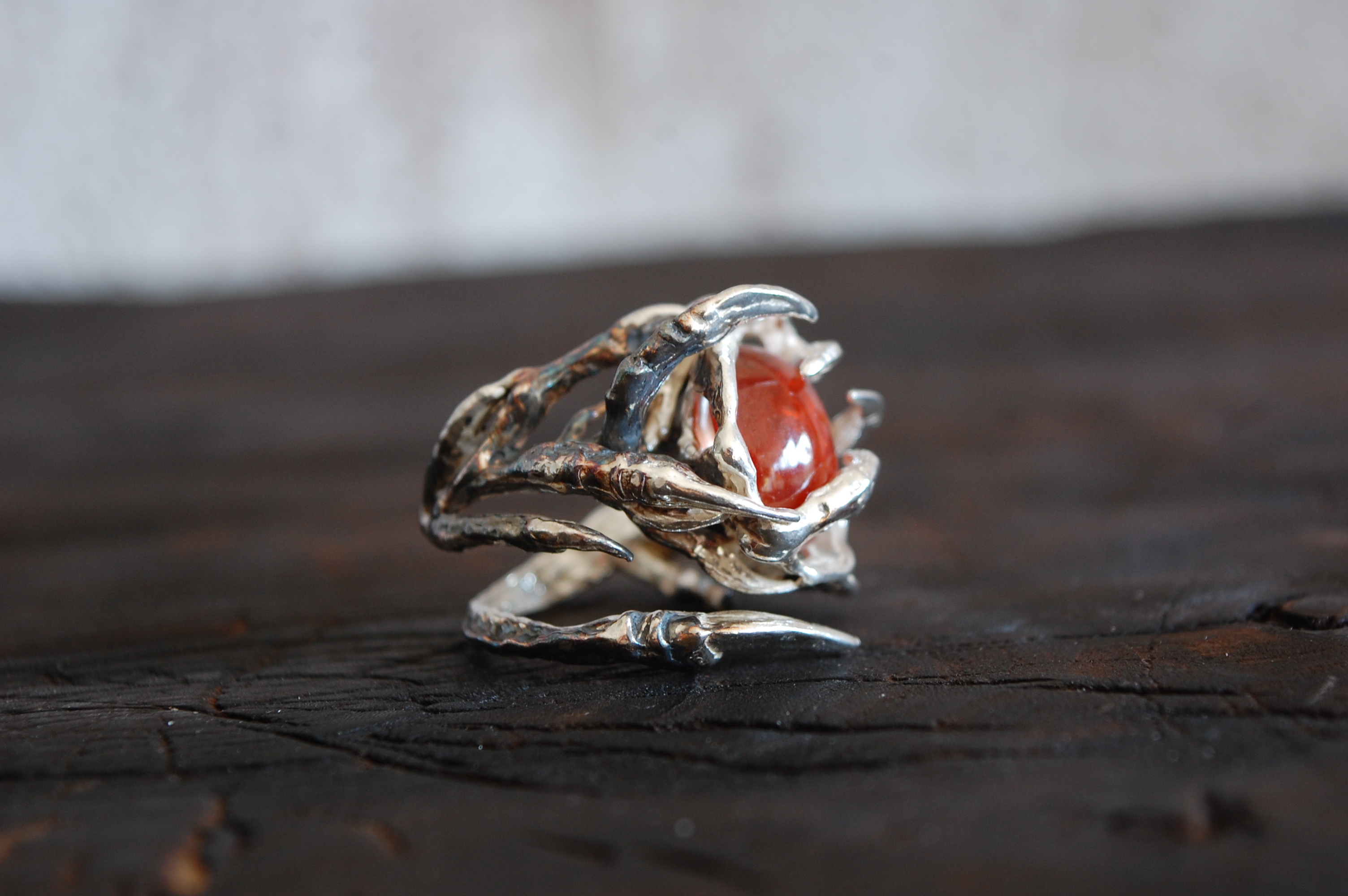 Custom orderThis ring is a sculptural talisman formed from a gathering of claws — delicate and sharp, like those of a crow — converging around a single stone of burning orange.