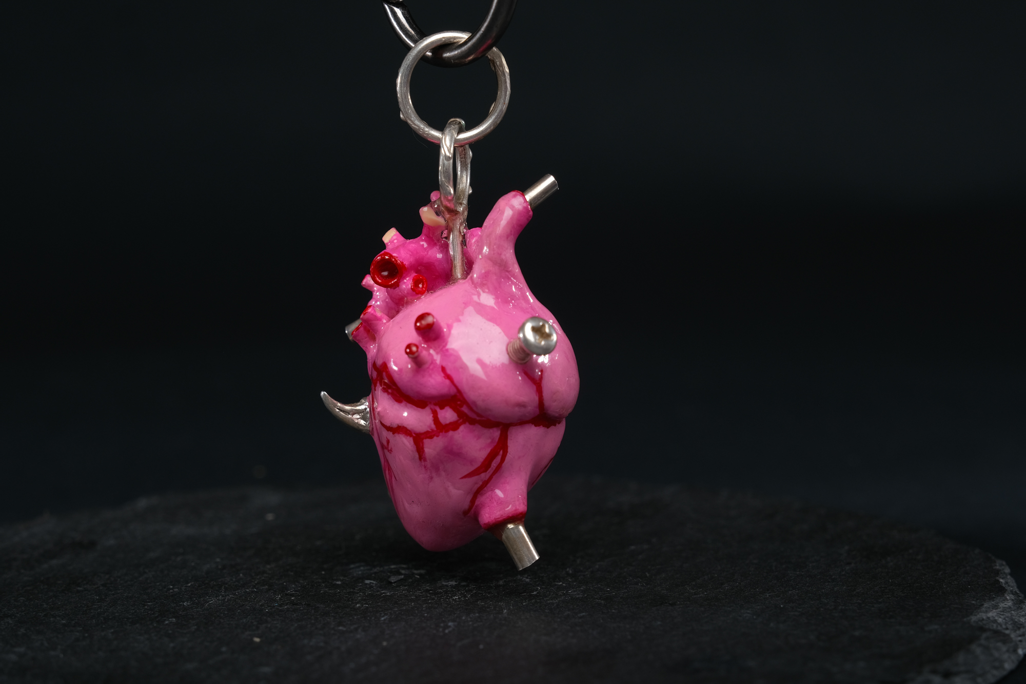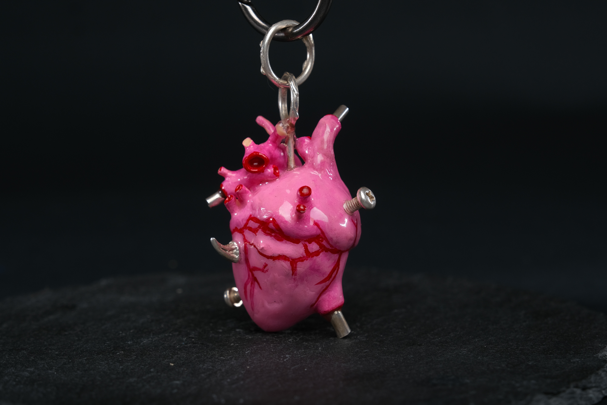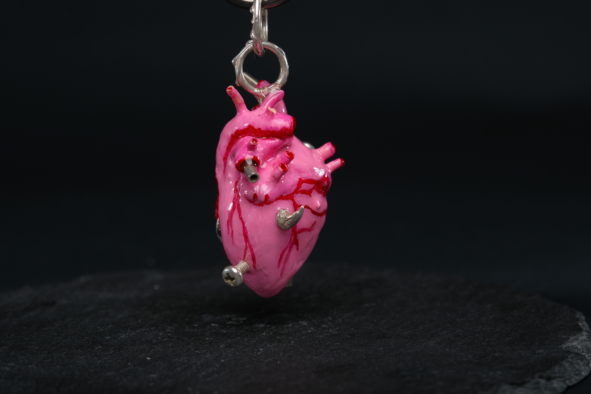 Each pendant is 3D-printed, then hand-painted in rose and red shades and sealed beneath a glass-like layer of resin, embracing a silver heart and silver bail at its core. Every piece is crafted by hand — no two hearts are ever the same.