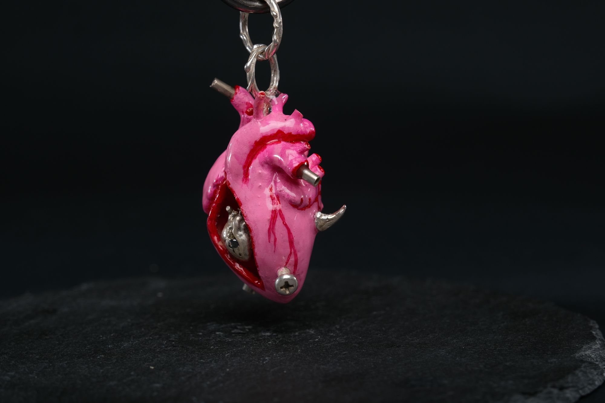 Each piece begins as a 3D-printed heart, carefully hand-painted in a soft rose hue, then sealed beneath a crystal layer of resin — preserving its glow like a spell caught in time. Hidden within its carved core rests a small silver heart with a little black stone inside, gleaming through the cut as a secret of strength and truth.