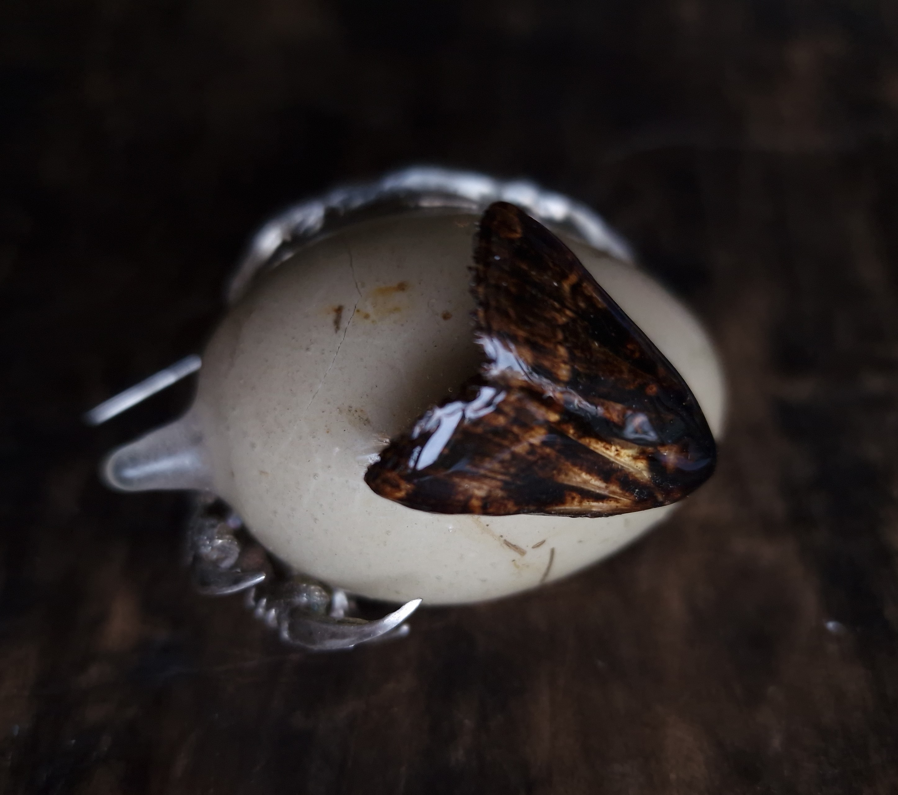 Resting on the surface of the egg is a large nocturnal moth, real, brown, and resin-preserved. An animal of night and transformation, drawn to darkness rather than light. Its presence seals the object’s meaning: metamorphosis without spectacle, change that happens in silence.