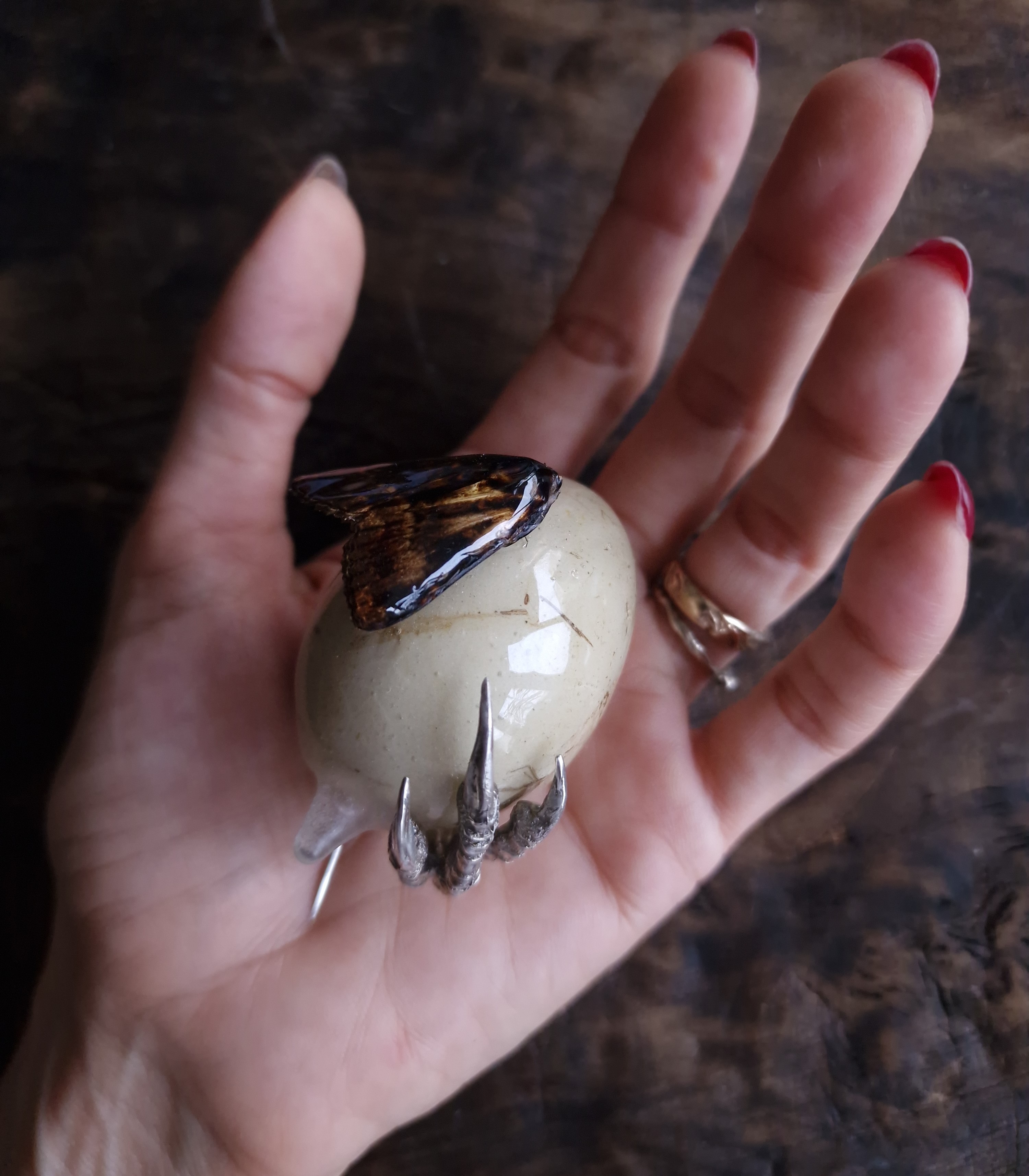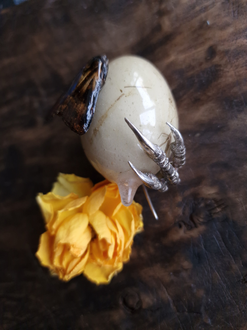 The egg is held in a silver setting shaped like crow claws, gripping it halfway — not possessive, but vigilant. The crow, creature of thresholds and watchers of passage, does not crush the egg; it guards what remains. Bone, shell, metal — all suspended in tension.