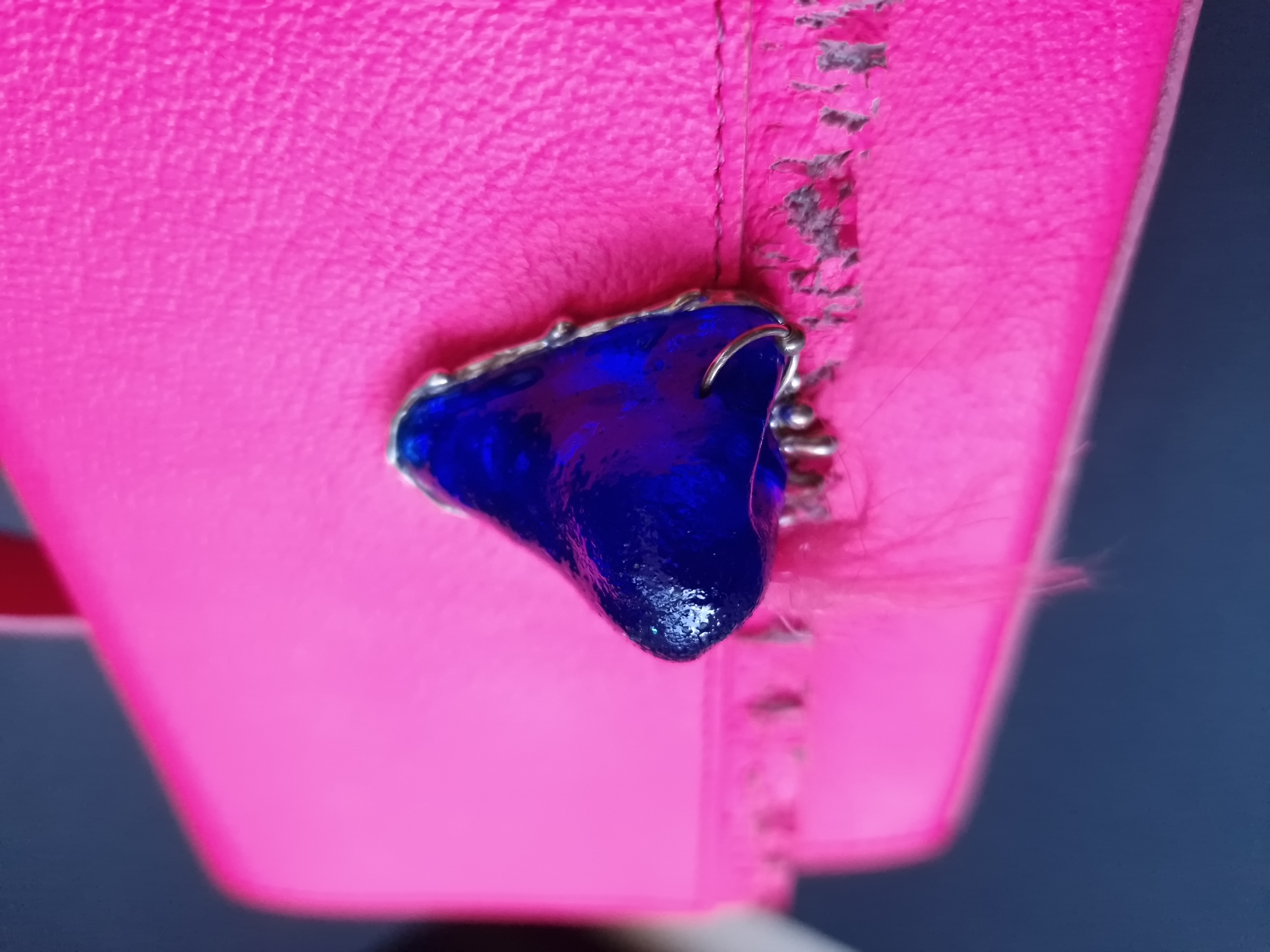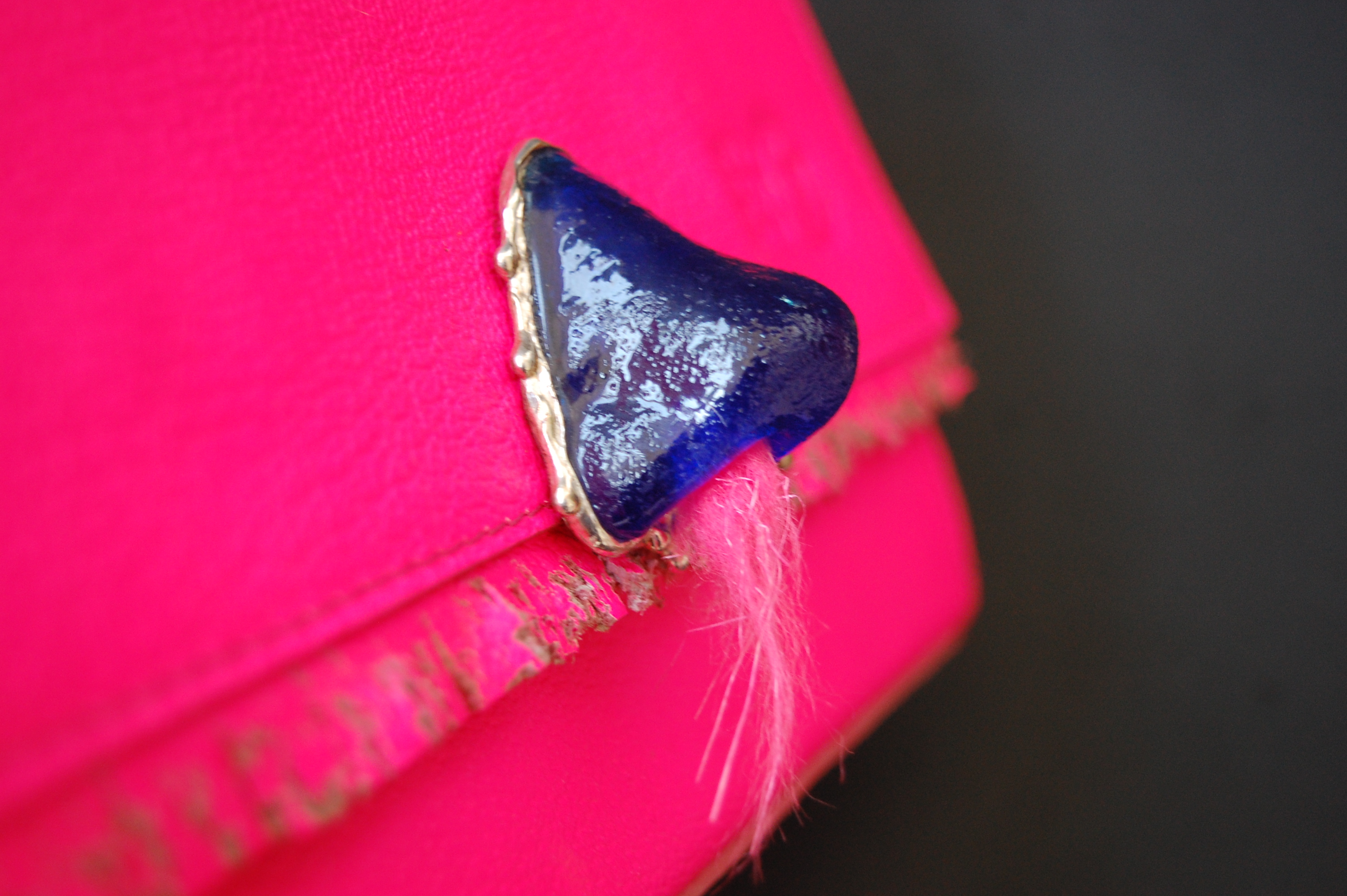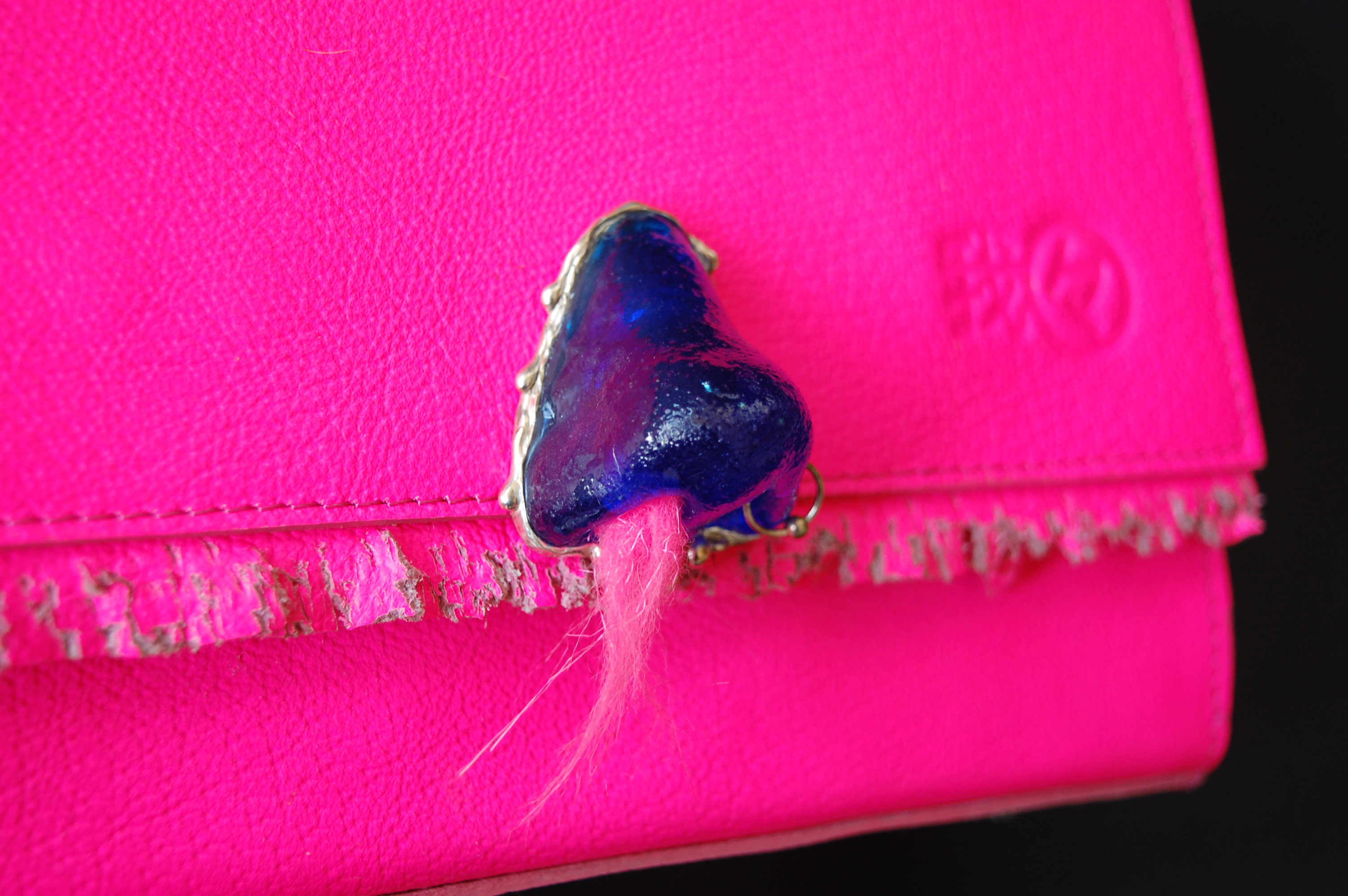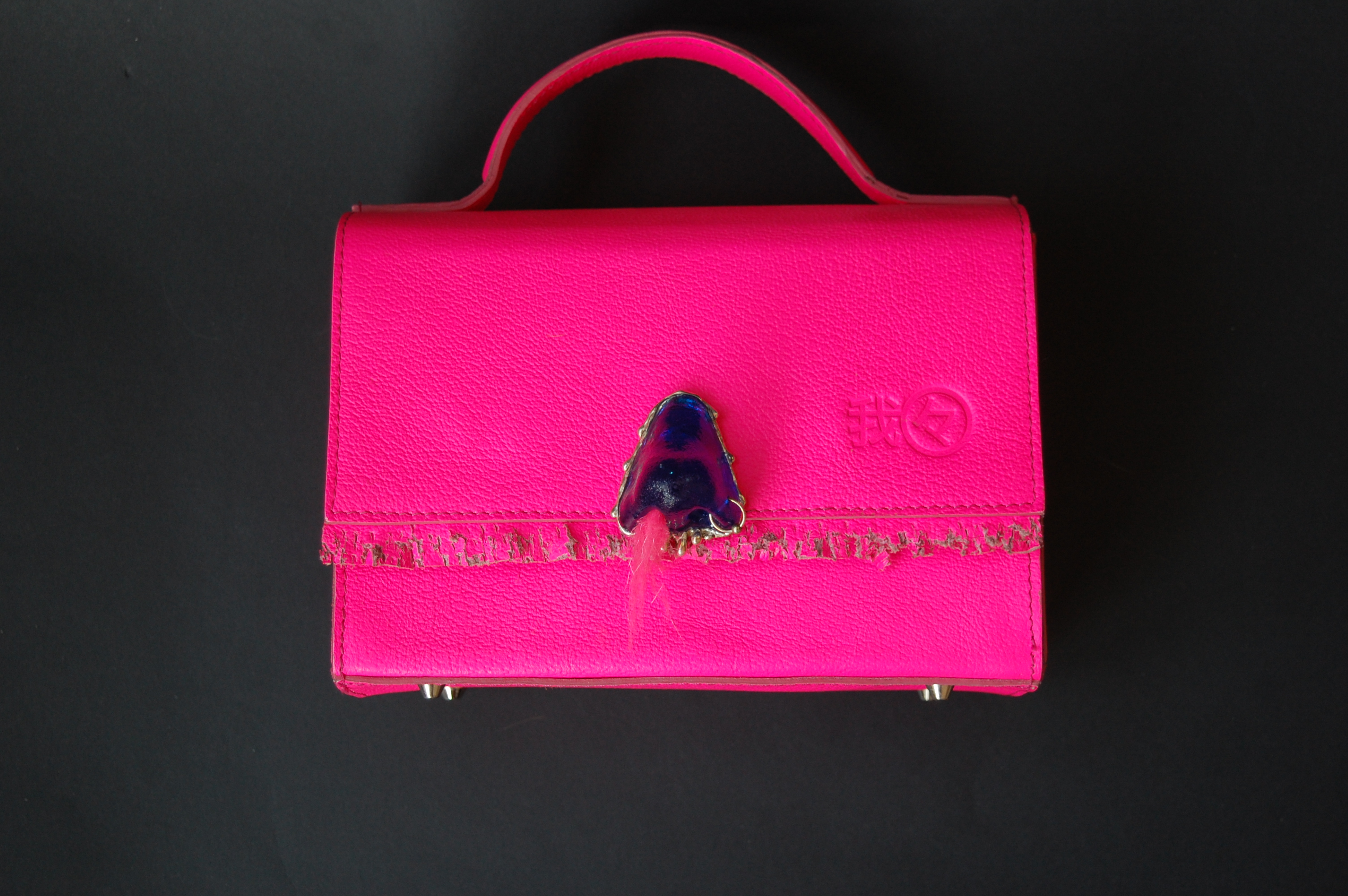 An intensely pink leather bag — almost exaggerated in its brightness — creates a surface that feels seductive, soft, and visually immediate. It draws the eye without resistance. Yet at its center, this sweetness is interrupted by a sculptural blue nose, cast from a real human form and framed in silver.