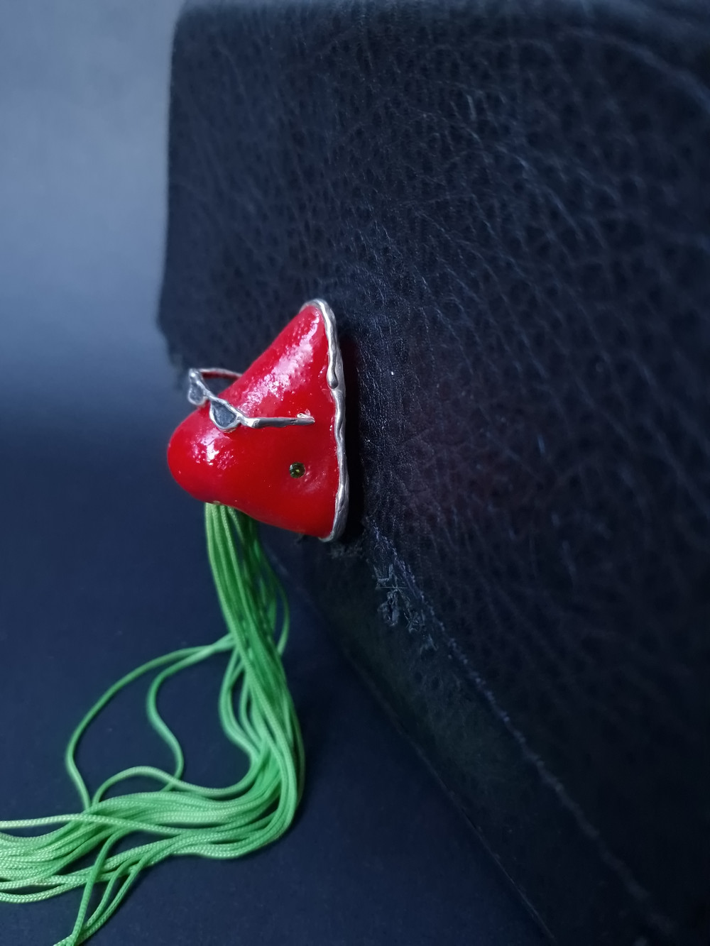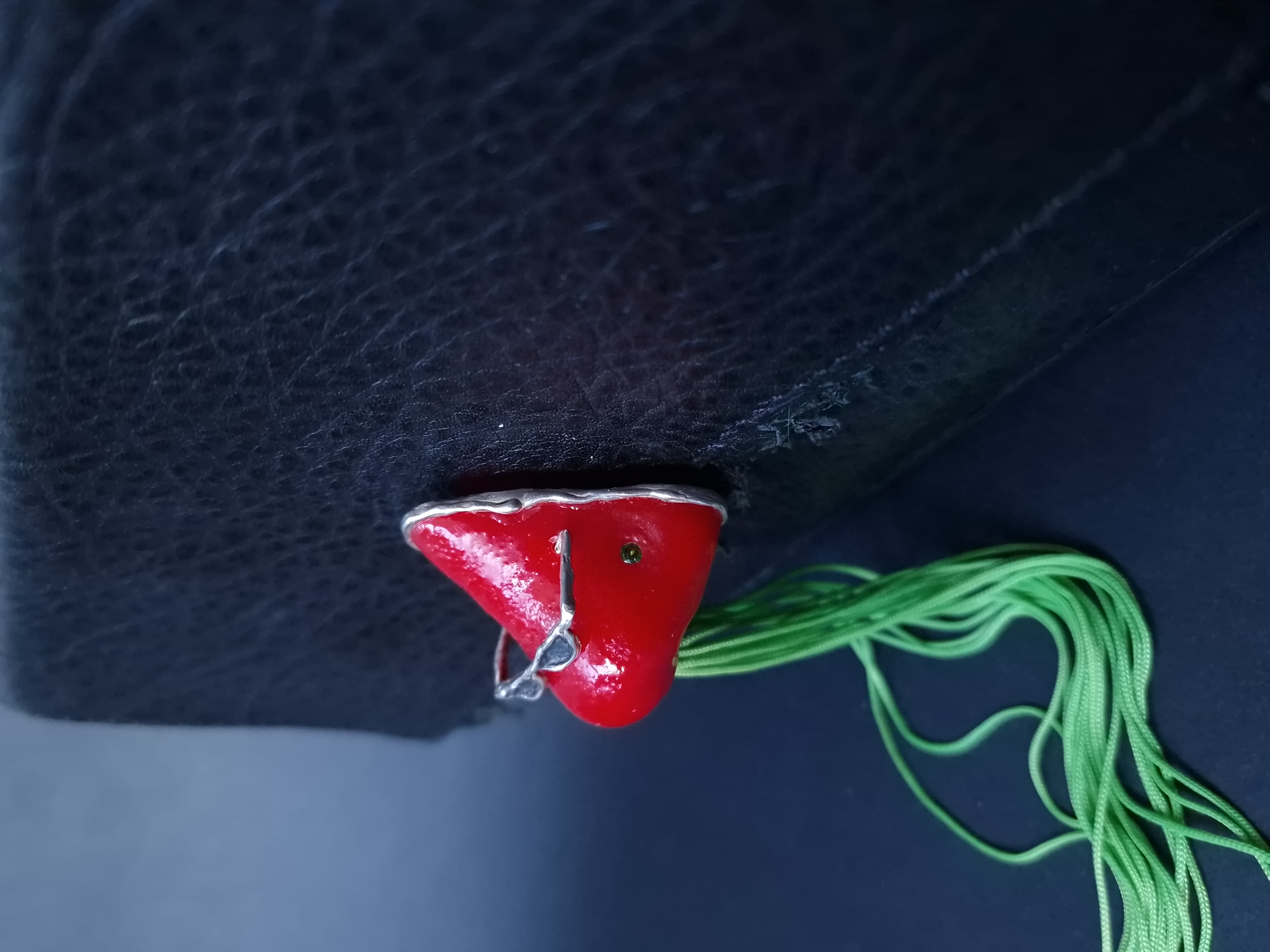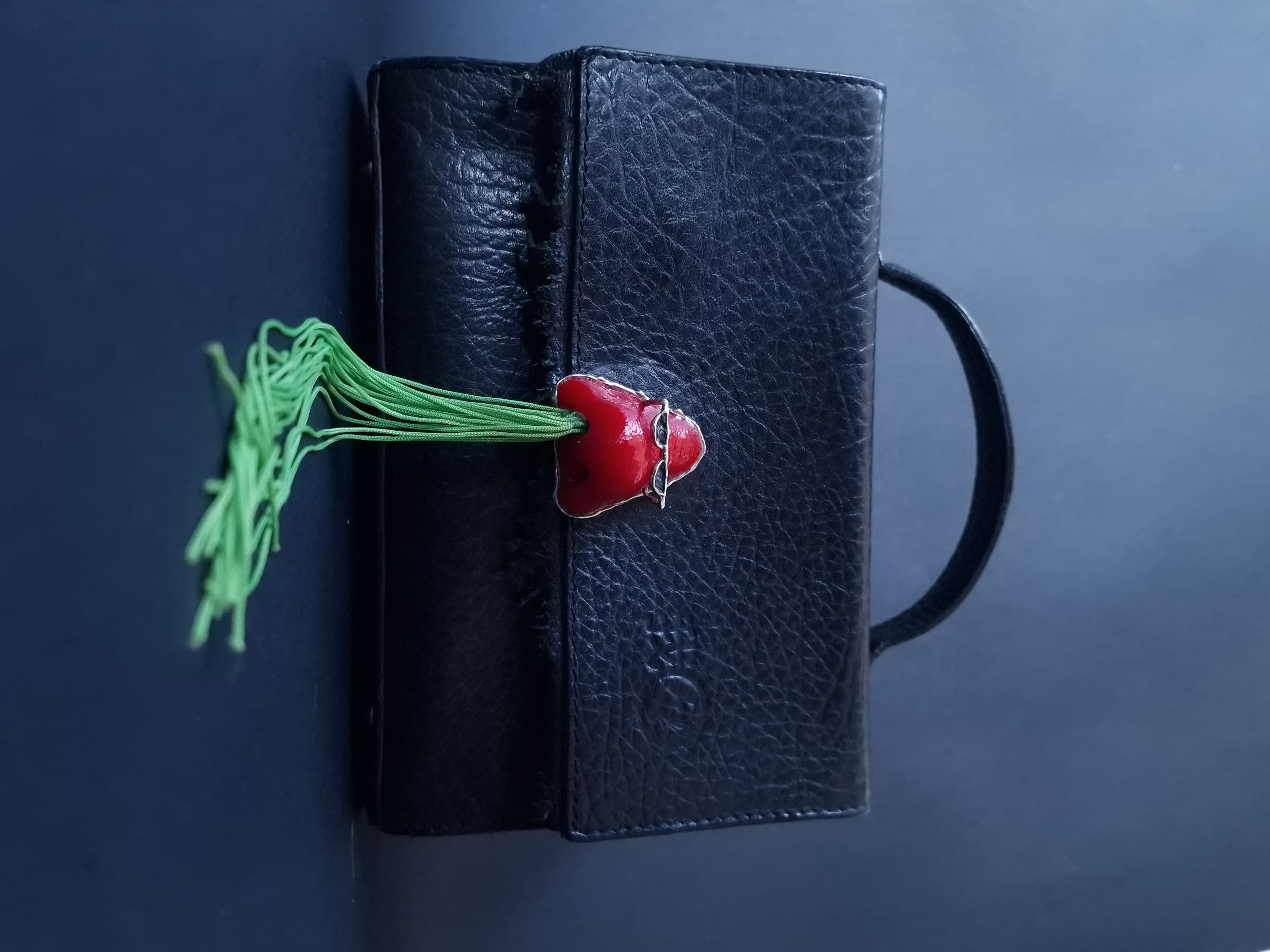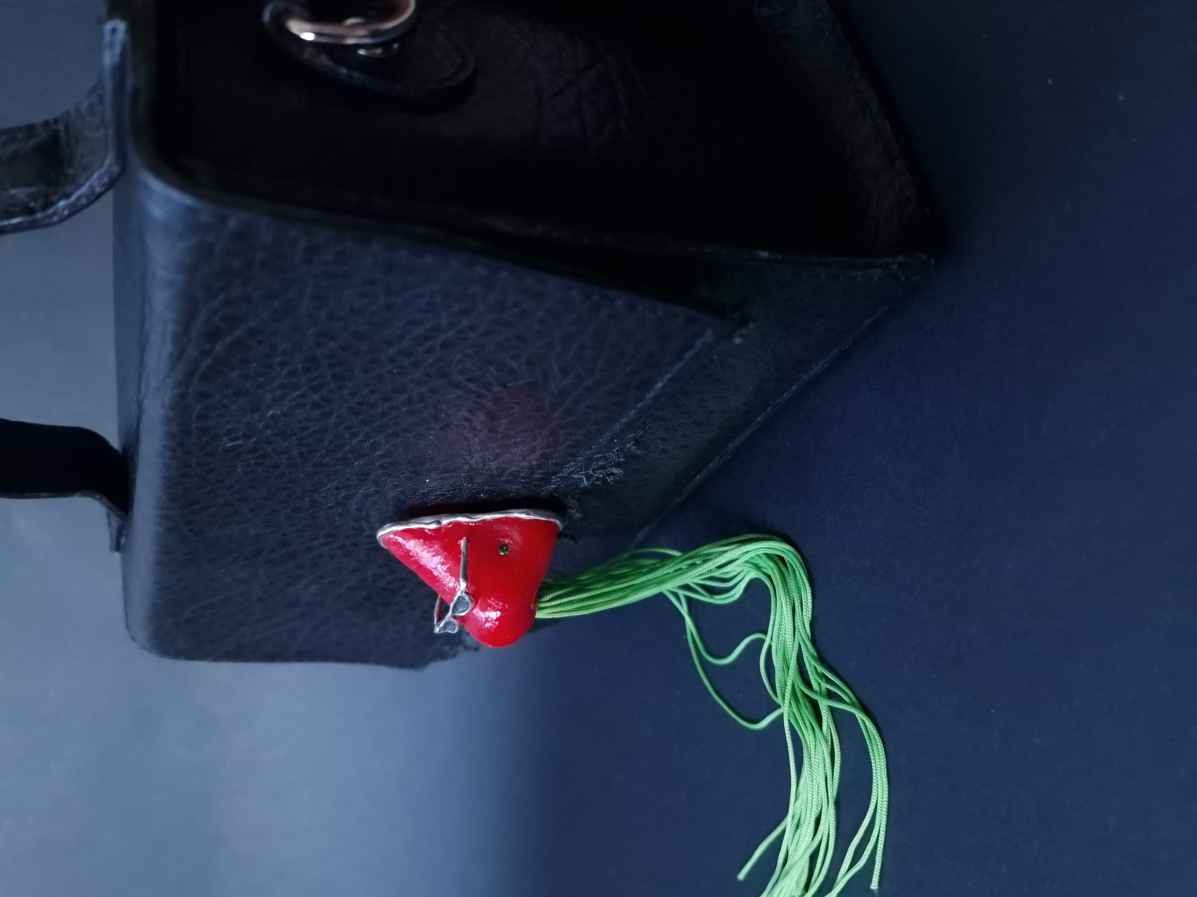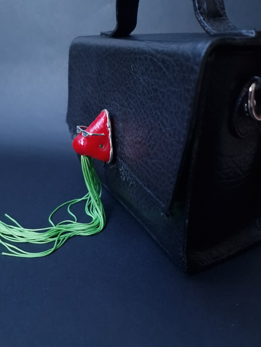A black leather bag provides a neutral, controlled surface. At its center, a red sculptural nose emerges — cast from a real human form, amplified in color and presence. It is immediate, almost visceral.