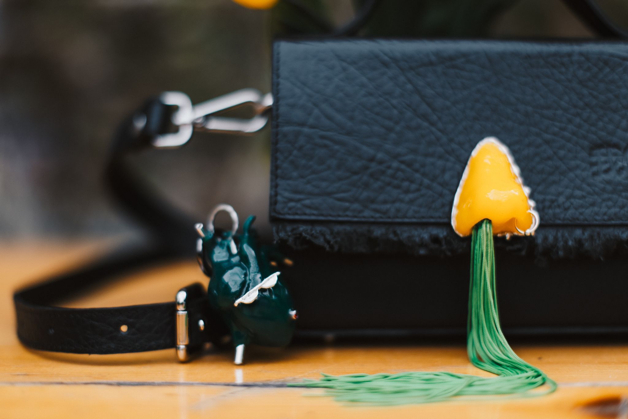 A black leather bag serves as a restrained, minimal base, interrupted by the presence of a sculptural yellow nose — cast from a real human form, preserving its intimate and imperfect anatomy. Framed in silver, the element becomes both elevated and exposed, turning a familiar feature into something confrontational.