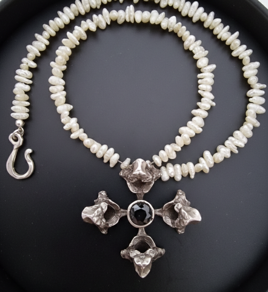 The brutality of bone is intentional. Vertebrae are not ornamental by nature — they are functional, protective, intimate. And yet here they are elevated, refined in silver, recontextualized into something unexpectedly delicate.