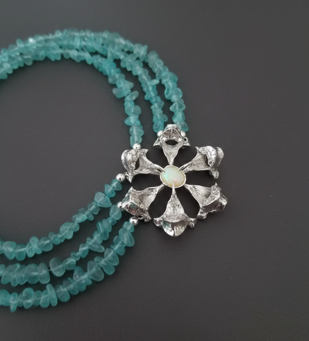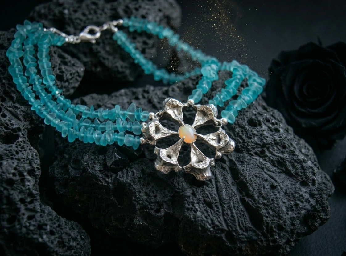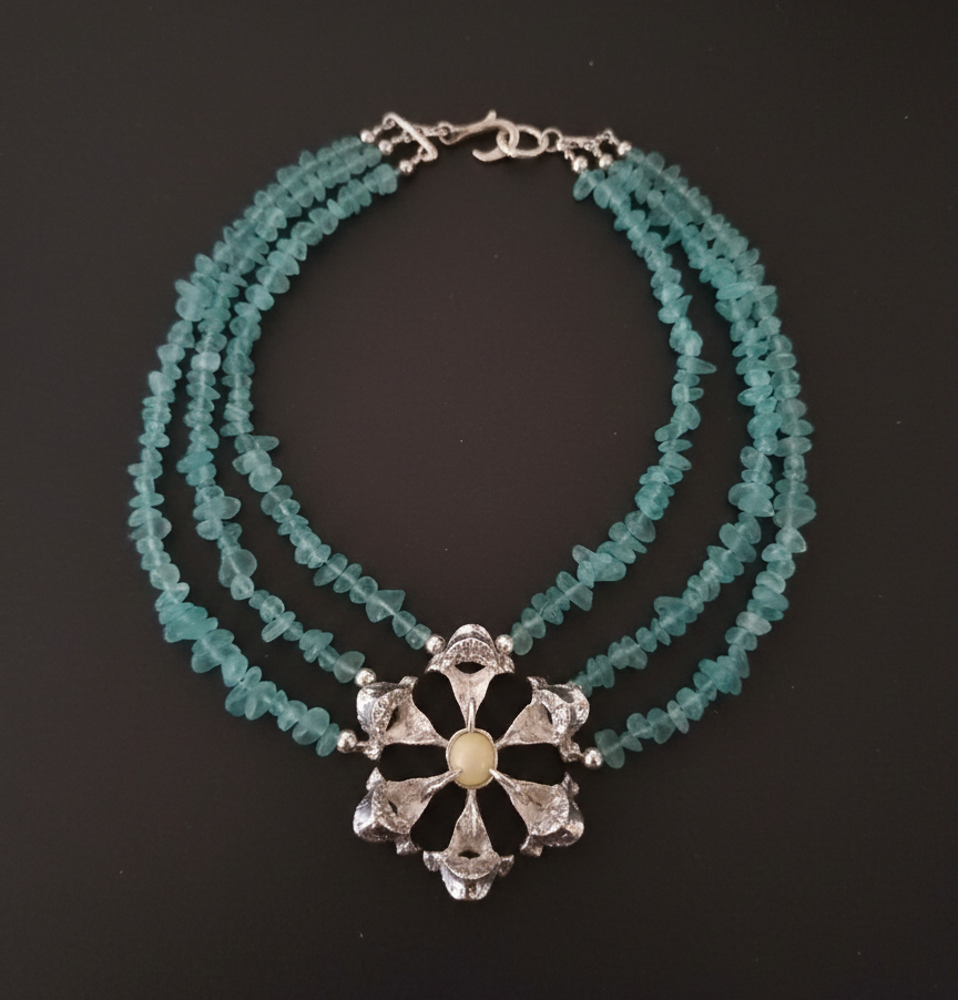 Custom Legacy: Built upon a triple strand of sea-blue stones, blending client-provided materials with artisanal metalwork.