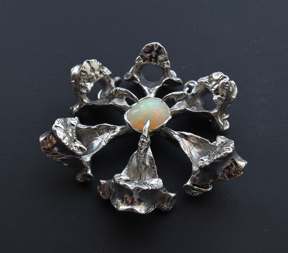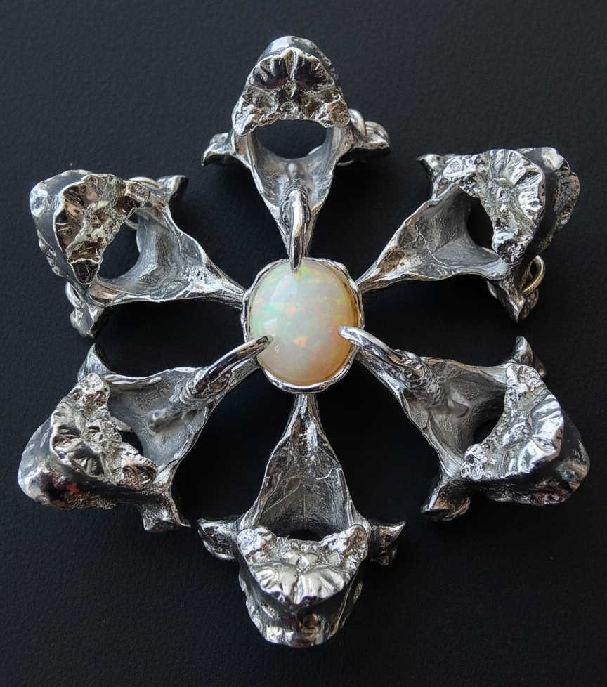 At the center of this talisman is a striking "vertebral flower," composed of six sterling silver fox vertebrae. Each petal is a direct cast of a real vertebra, capturing the hauntingly beautiful, organic details that only nature can design. Nestled in the heart of this silver bloom is a luminous fire opal, glowing with an inner warmth that anchors the entire composition. The opal is settled using 3 pigeon claws.