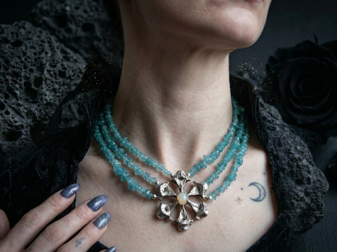 A standout piece from the Vertebral Collection, the Azure Guardian is a bespoke masterwork that breathes new life into raw, biological forms. This necklace is a study in contrasts—the cool, fluid texture of the sea meets the rigid, intricate architecture of the spine.