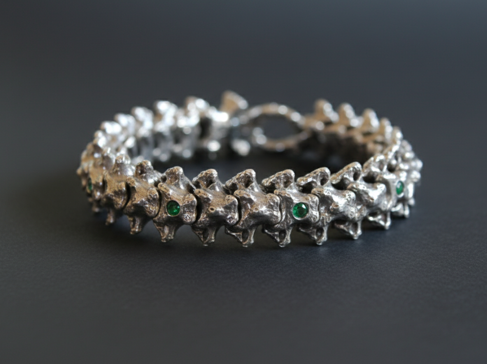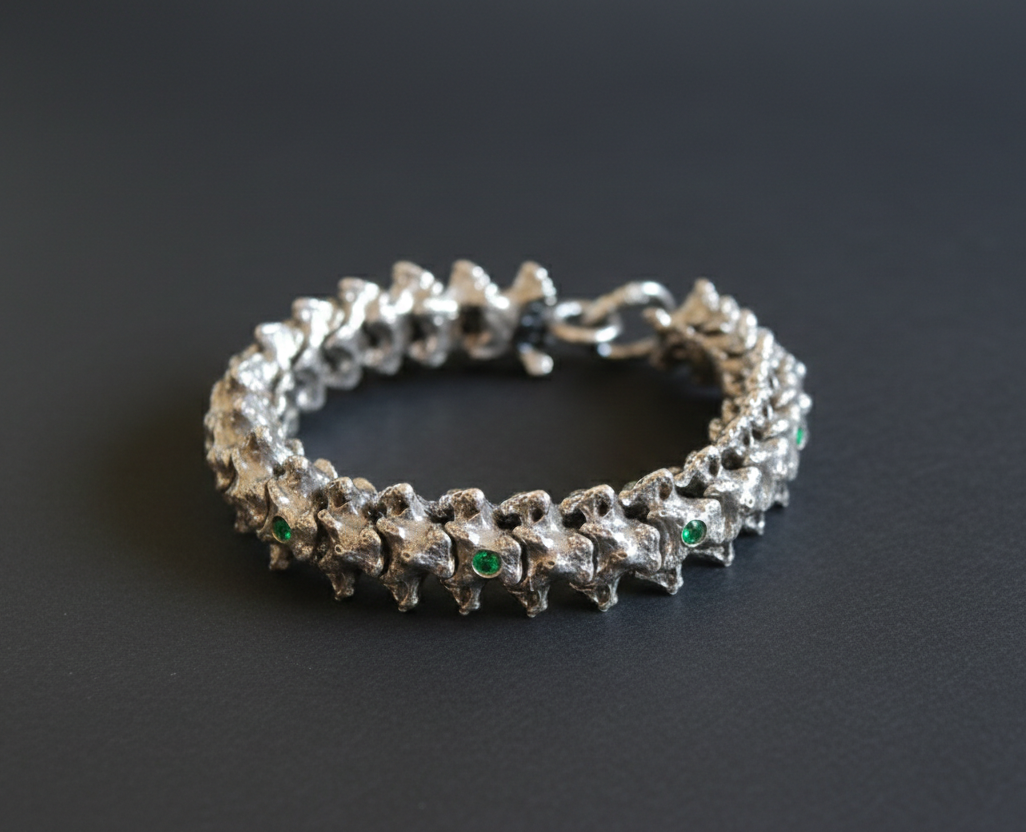 Custom order“The Rooster’s Spine” – Silver Vertebra Bracelet with green stones