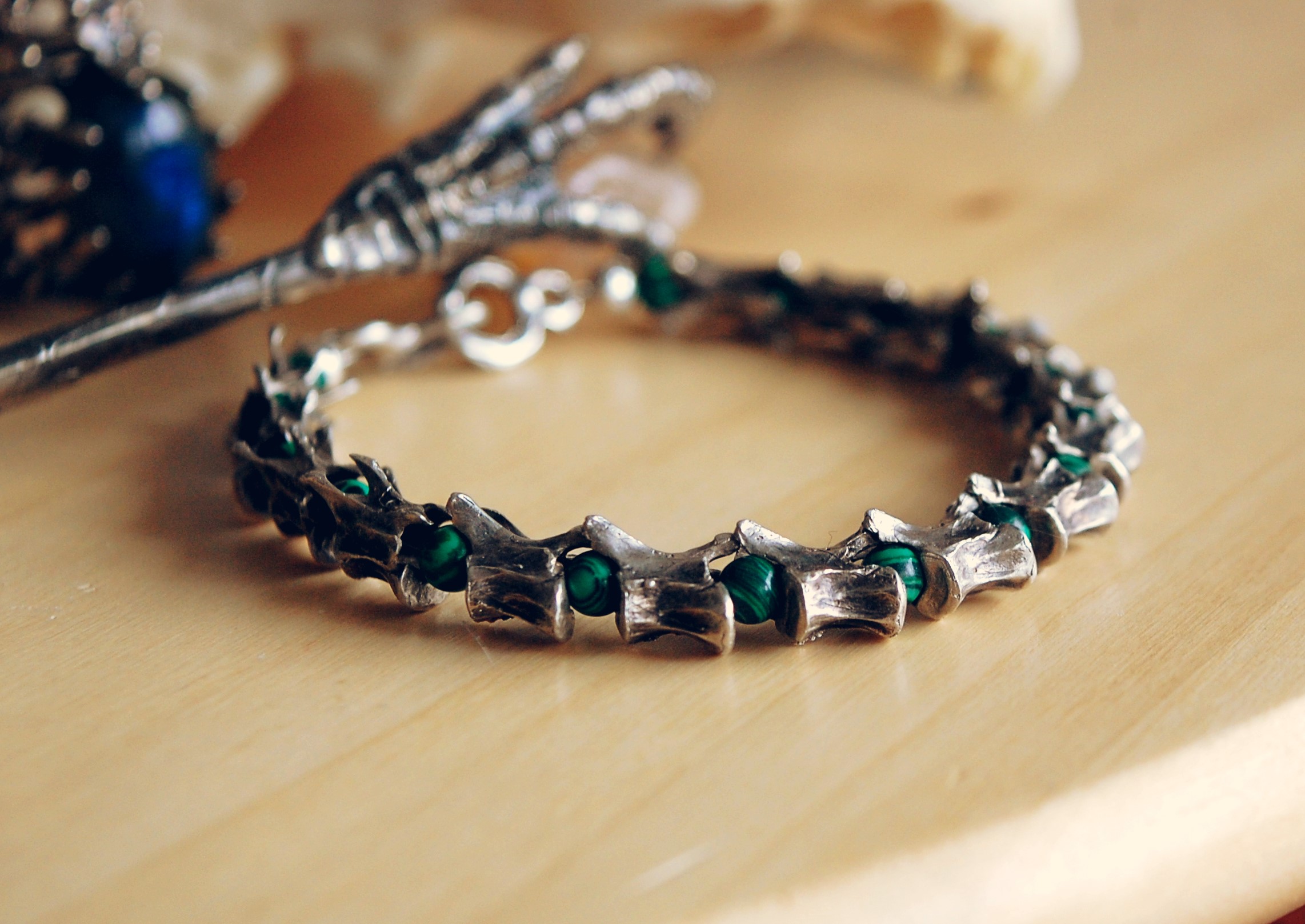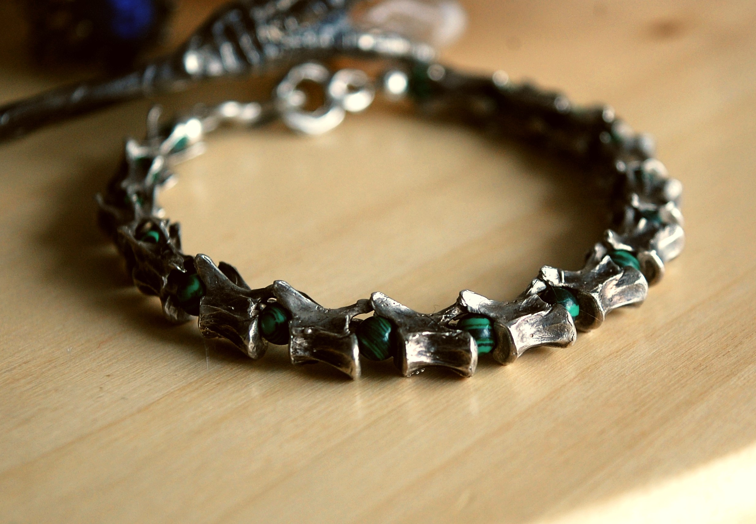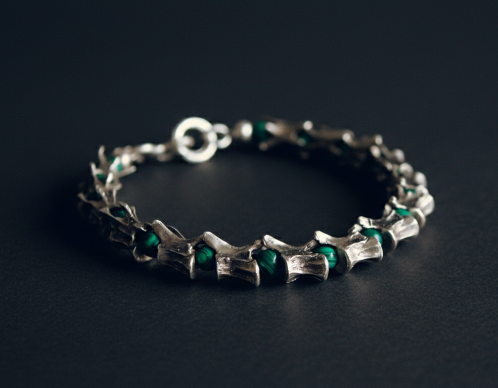 Crafted from sterling silver casts of delicate squirrel vertebrae, each link preserves the intricate details of the natural bone structure. Interspersed between these silver relics are beads of Malachite, known as the stone of transformation and protection. The deep, swirling greens of the malachite provide a vibrant contrast to the antiqued silver, evoking the lush forests where life and earth intertwine.
