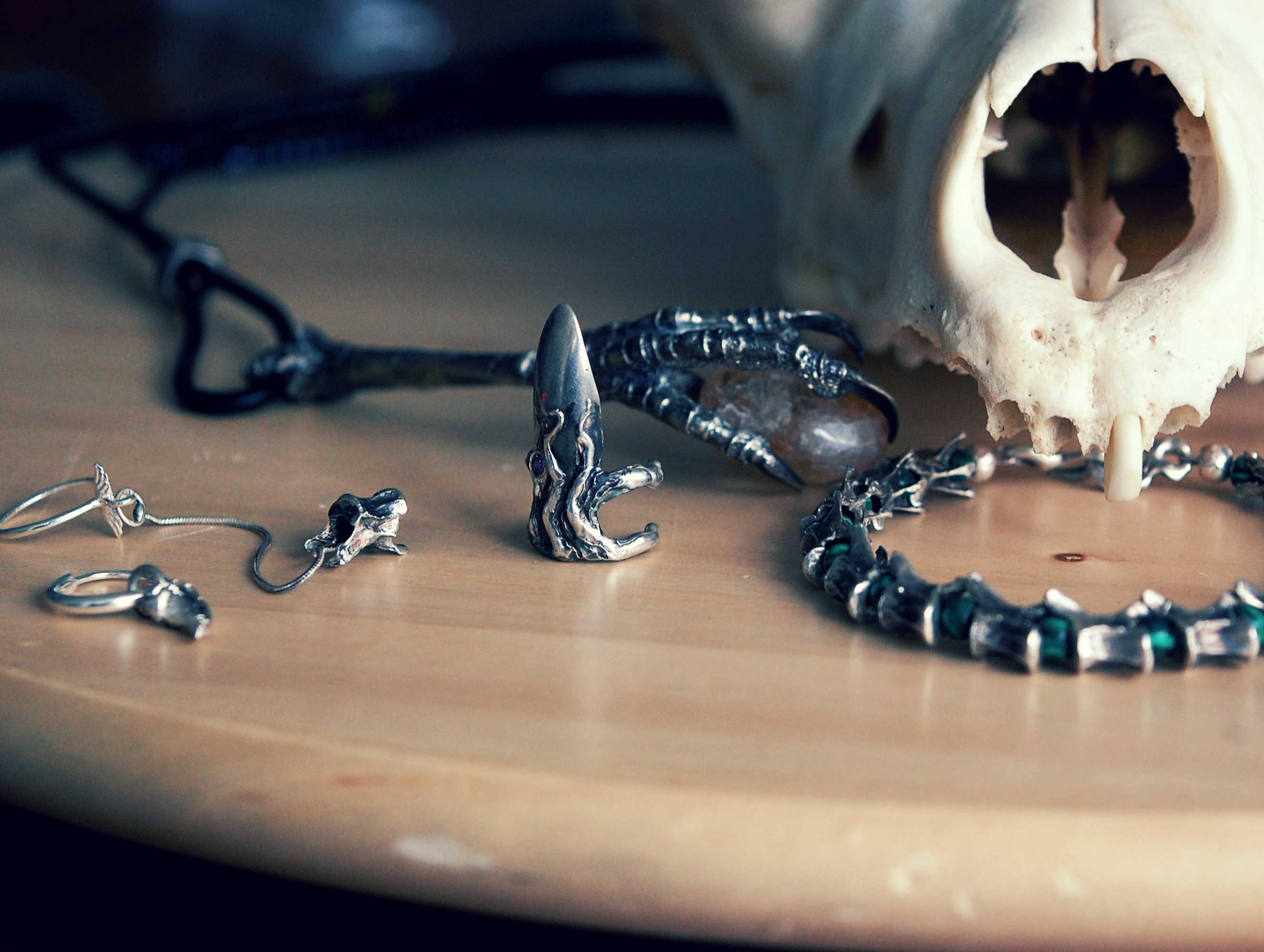 Organic Castings: Features sterling silver vertebrae meticulously cast to capture every anatomical detail.