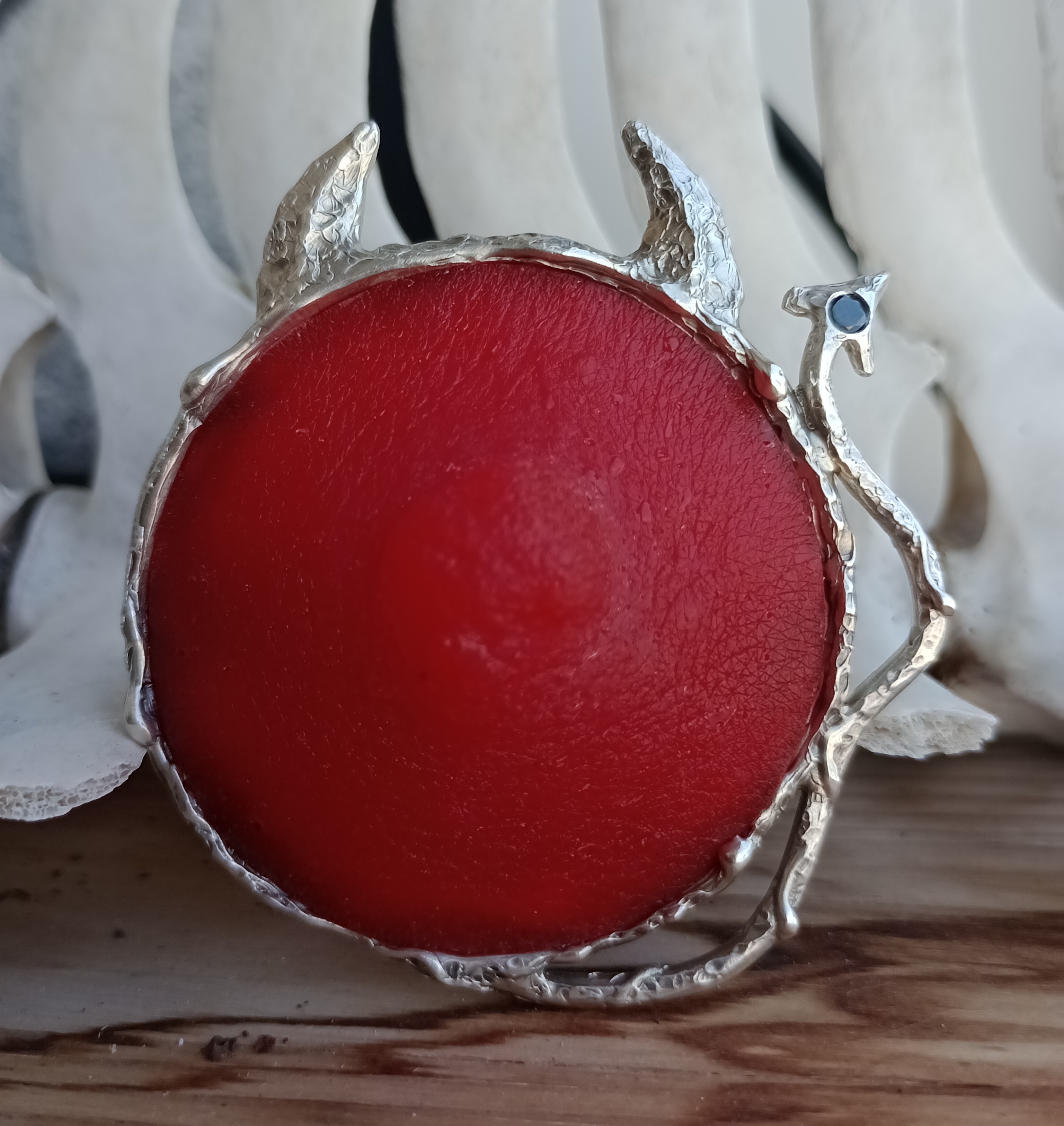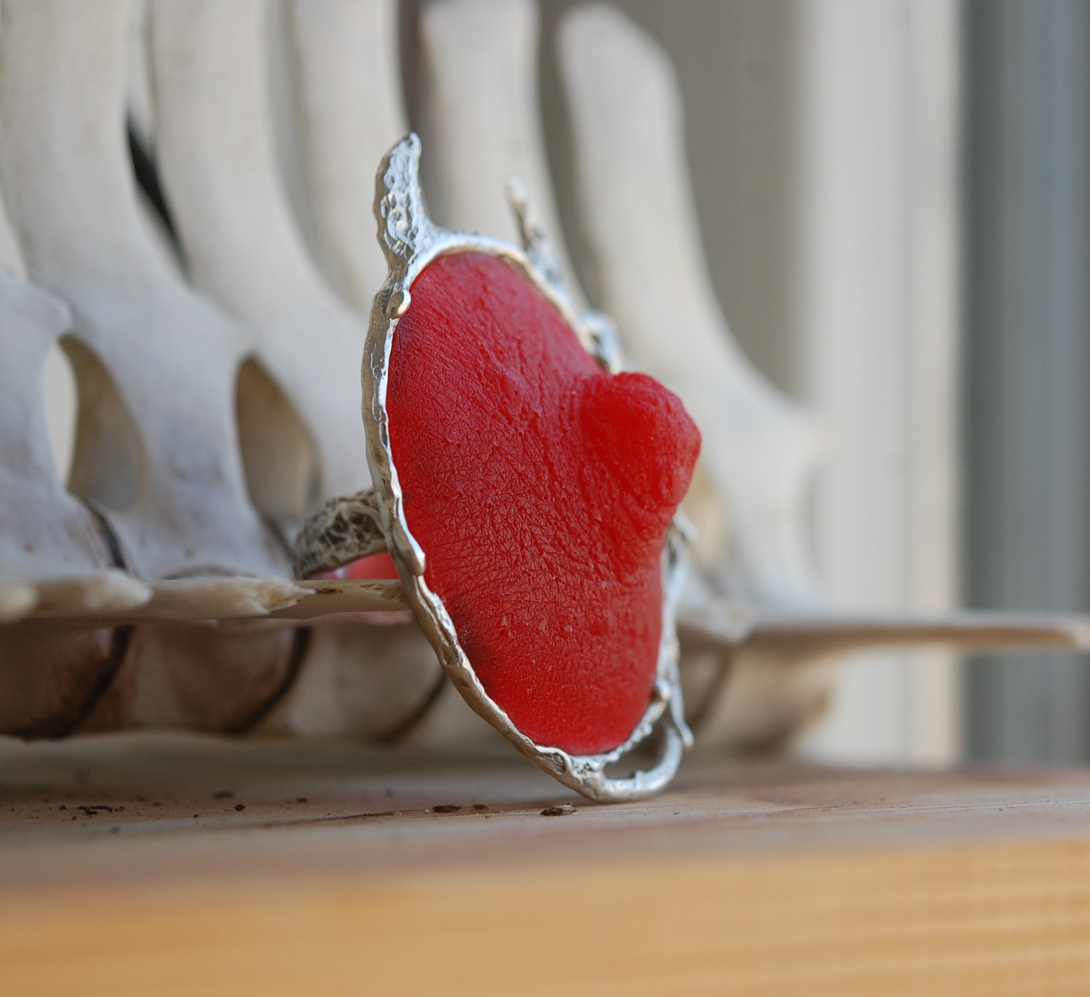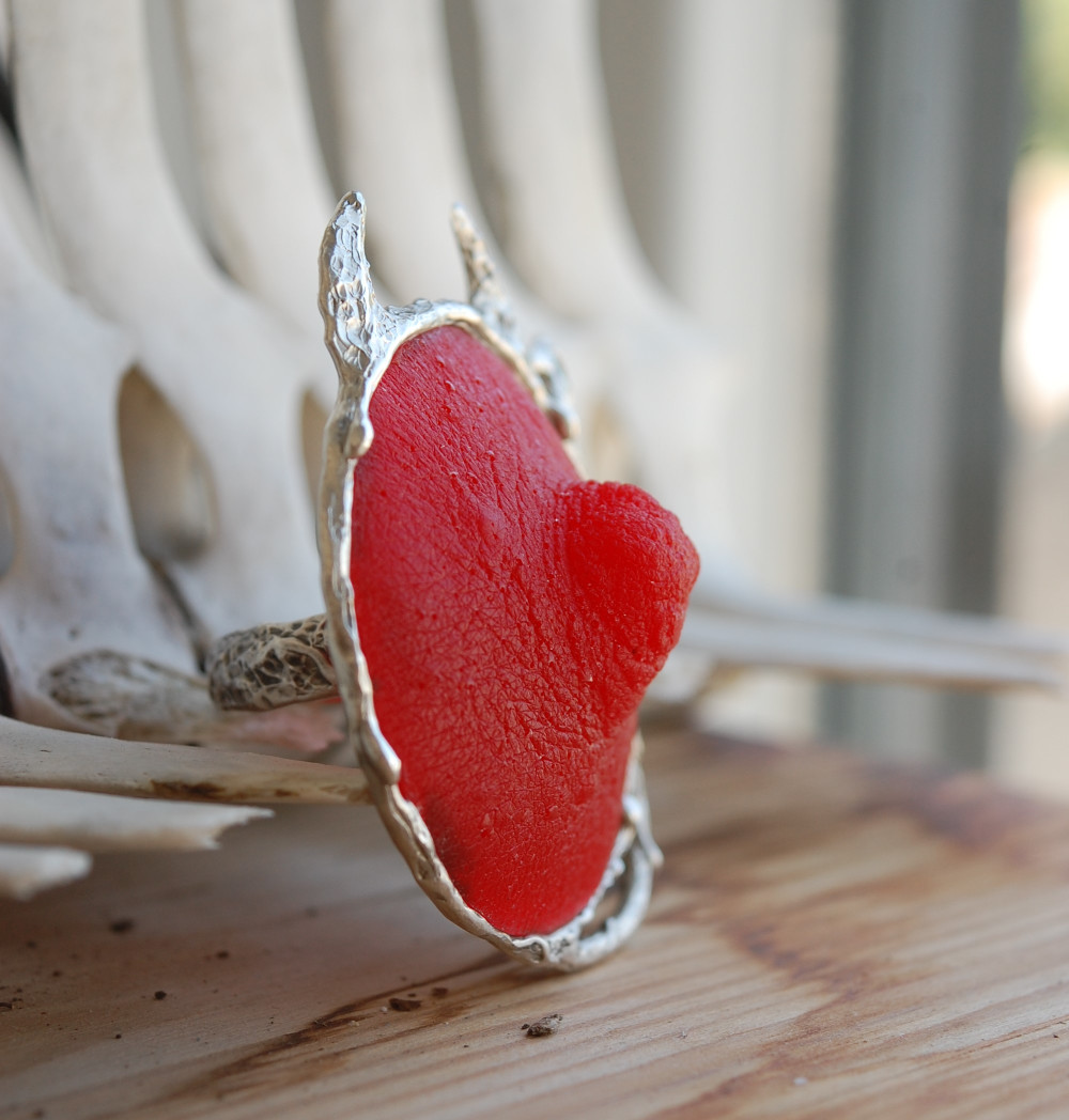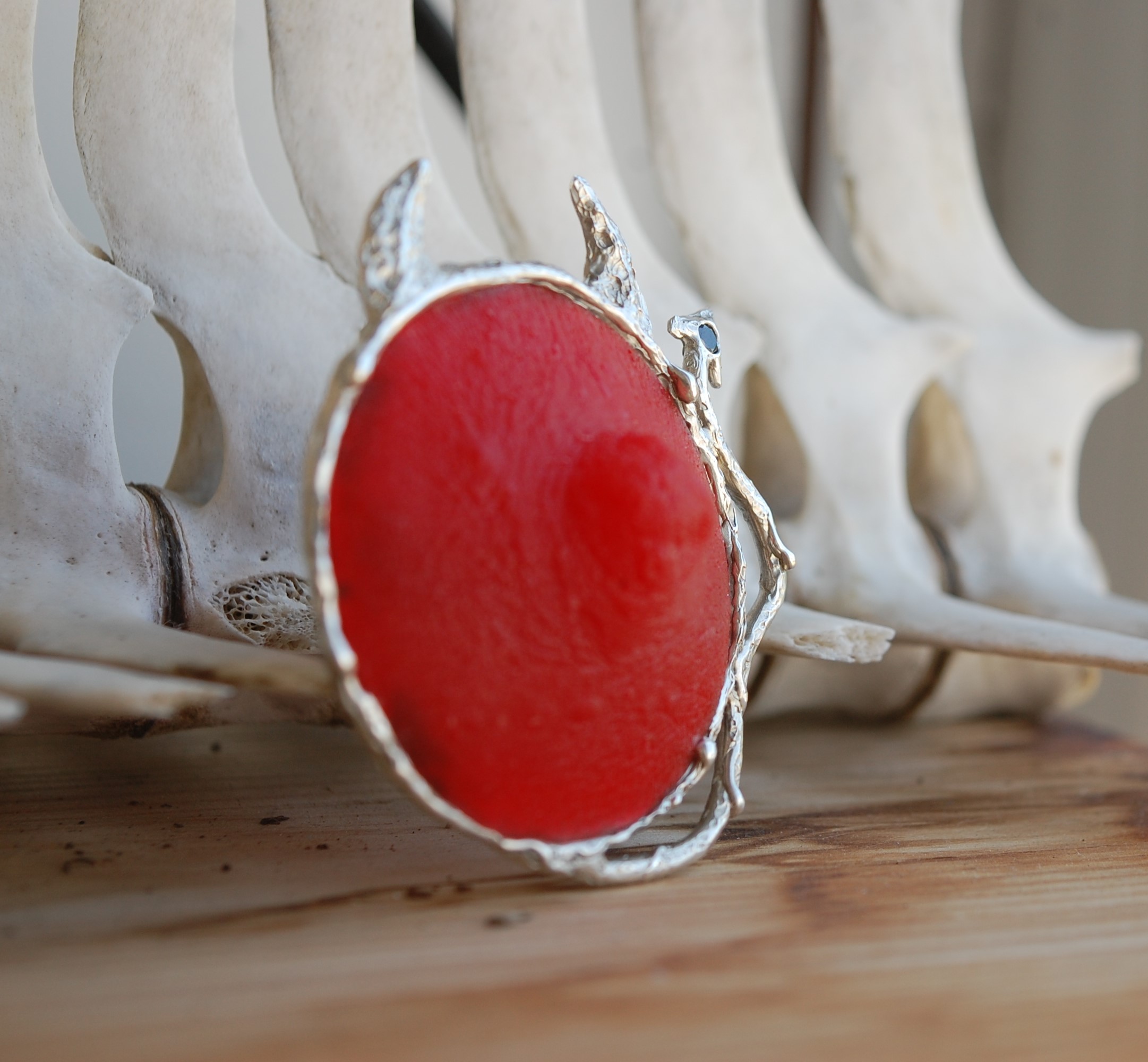 Bold, imposing, and impossible to ignore, this ring plays with desire, provocation, and temptation. It sits heavily on the hand, both physically and symbolically, transforming the body into a site of confrontation and allure. The contrast between the intense red core and the raw, textured silver amplifies its erotic tension and sculptural presence.
